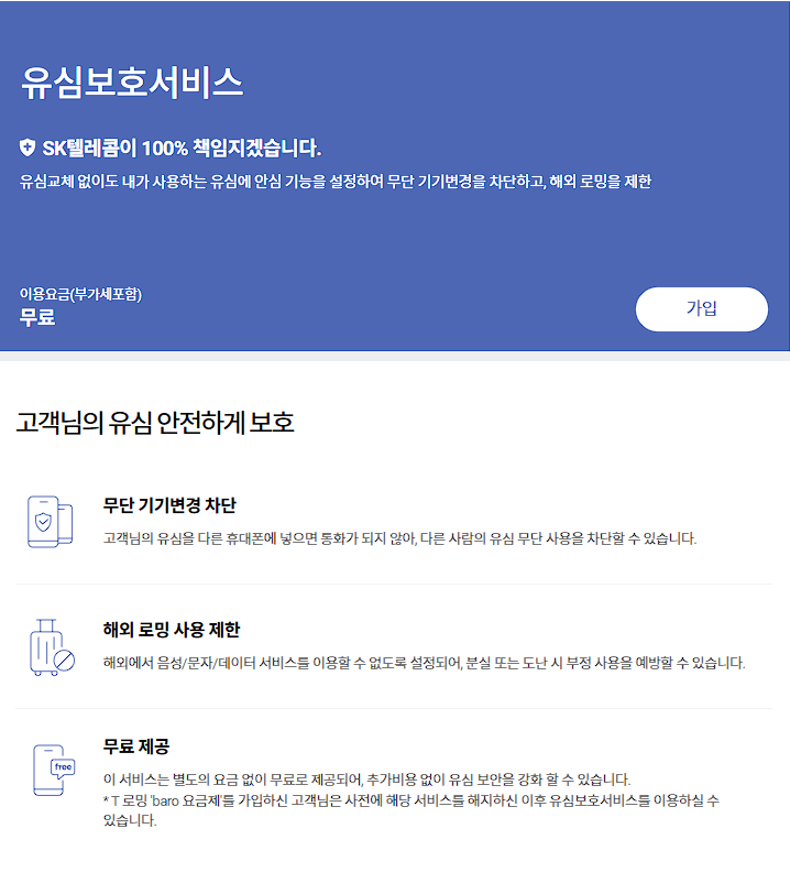 즉, 누군가 내 핸드폰을 훔쳐서 해외에서 요금 폭탄을 만들어도 유심보호 서비스가 이를 막아주는 거죠.